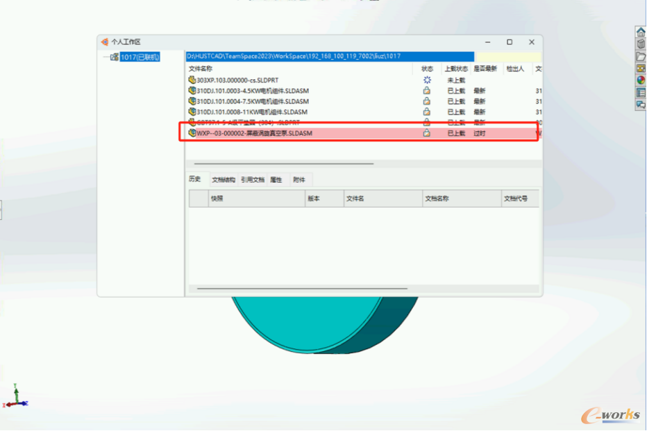 当借用别人的模型设计时,如果借用的模型被别人进行了修改,并将修改检入到了服务器,此时,总图或部件设计工程师在自己的工作区通过协同感知功能,可以明显地得知服务器上有最新版本,需要更新的设计文档在工作区中以红色高亮显示。